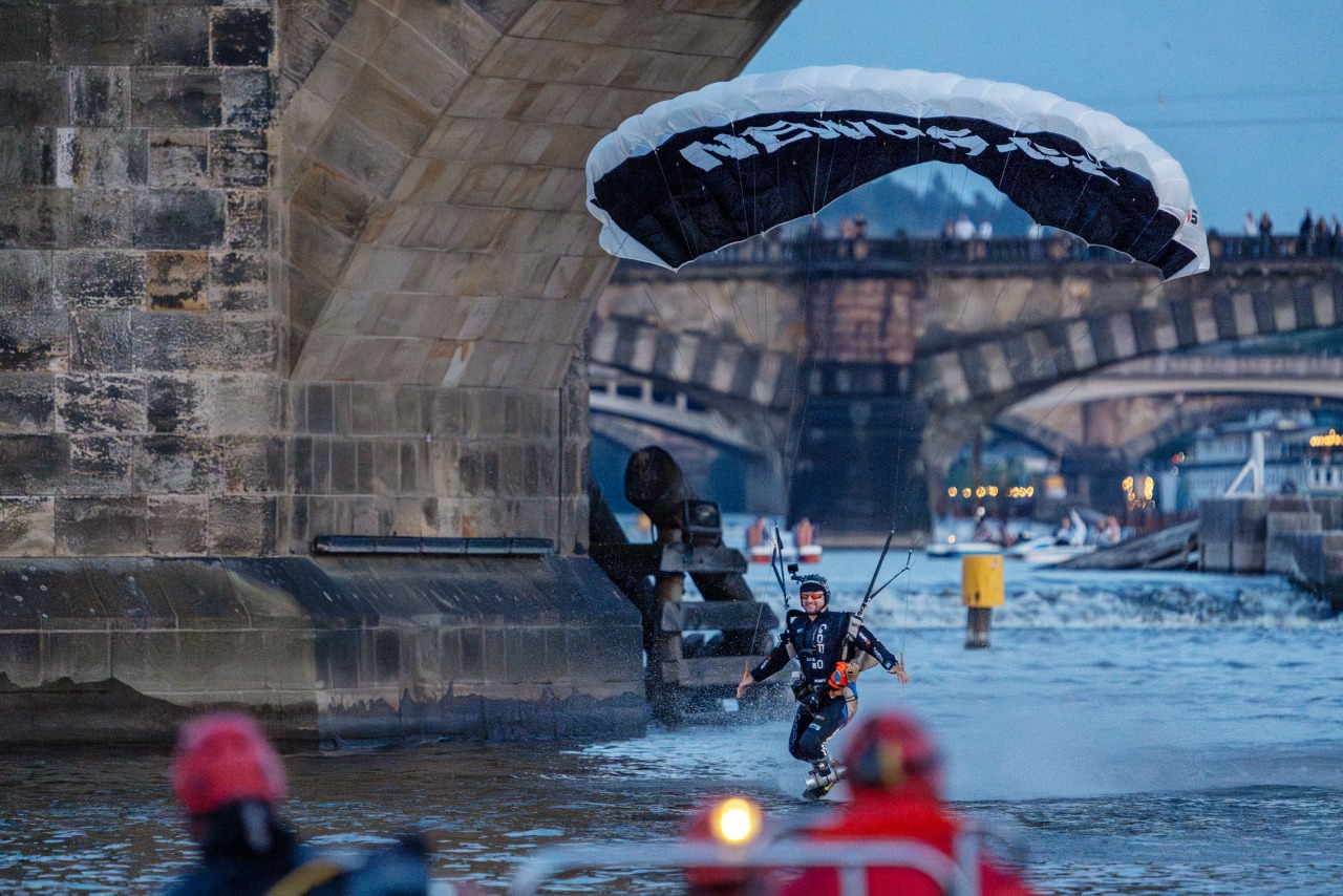 Pět hvězd tradičně snášelo se z oblohy i letos v podobě osvětlených parašutistů, vypouštějících světelné ohnivé ohony z flér. Šestý z nich pak podletěl na padáku oblouk Karlova mostu a přistál v řece, opět jako symbol Sv. Jana...